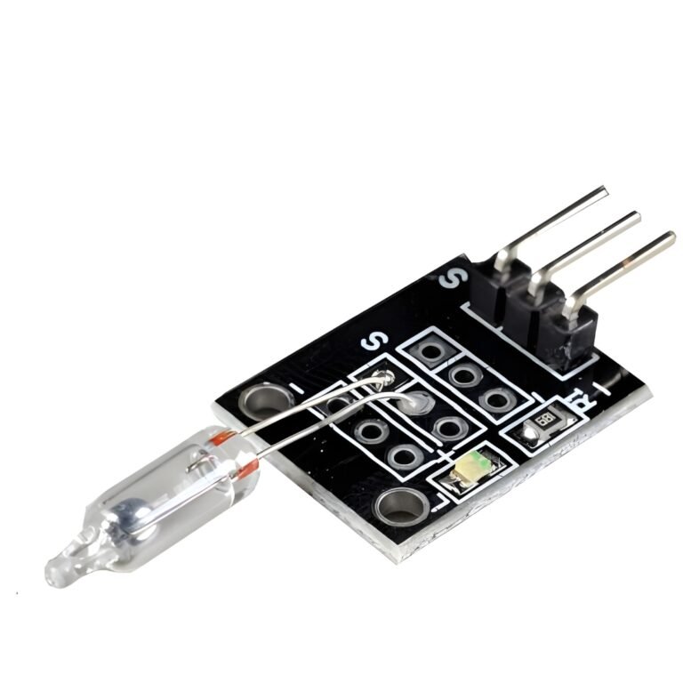 El módulo interruptor de mercurio es un sensor de inclinación que detecta cambios de posición mediante una ampolla sellada con mercurio. Al inclinarse, el mercurio cierra o abre el circuito, entregando una salida digital ON/OFF. Es ideal para alarmas por inclinación, detección de movimiento básico y proyectos educativos con Arduino y ESP32.